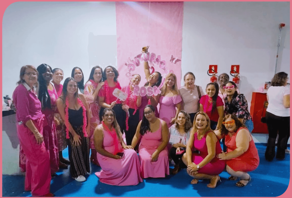 Embora a luta contra o câncer de mama seja um tema delicado, a equipe técnica do E.E.I.: Escola de Educação Infantil registrou o momento com leveza e descontração.