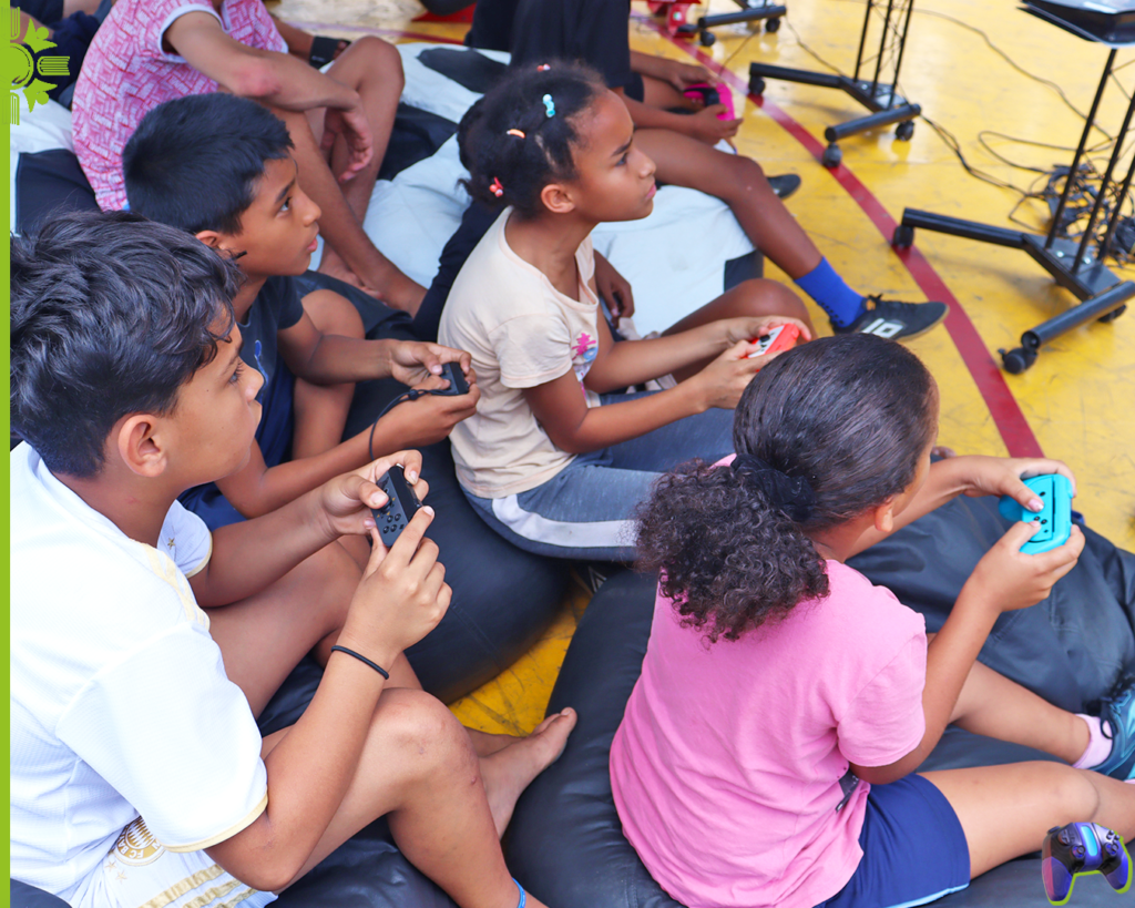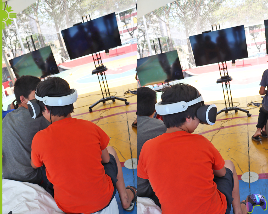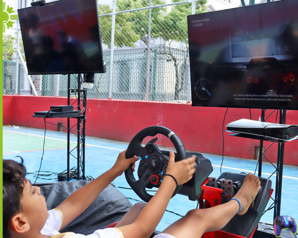Teve jogos para todos os gostos no evento: do aparato de Realidade Virtual do PlayStation para sentir a emoção de um jogo de terror, passando pelo clássico Mario Kart 8 Deluxe do Nintendo Switch, até o tradicional FIFA, garantindo diversão e muita adrenalina! O clássico simulador de corridas reais do PlayStation 5 – Gran Turismo 7 era equipado por um aparato especial com volante, assento confortável e comanche de marcha.